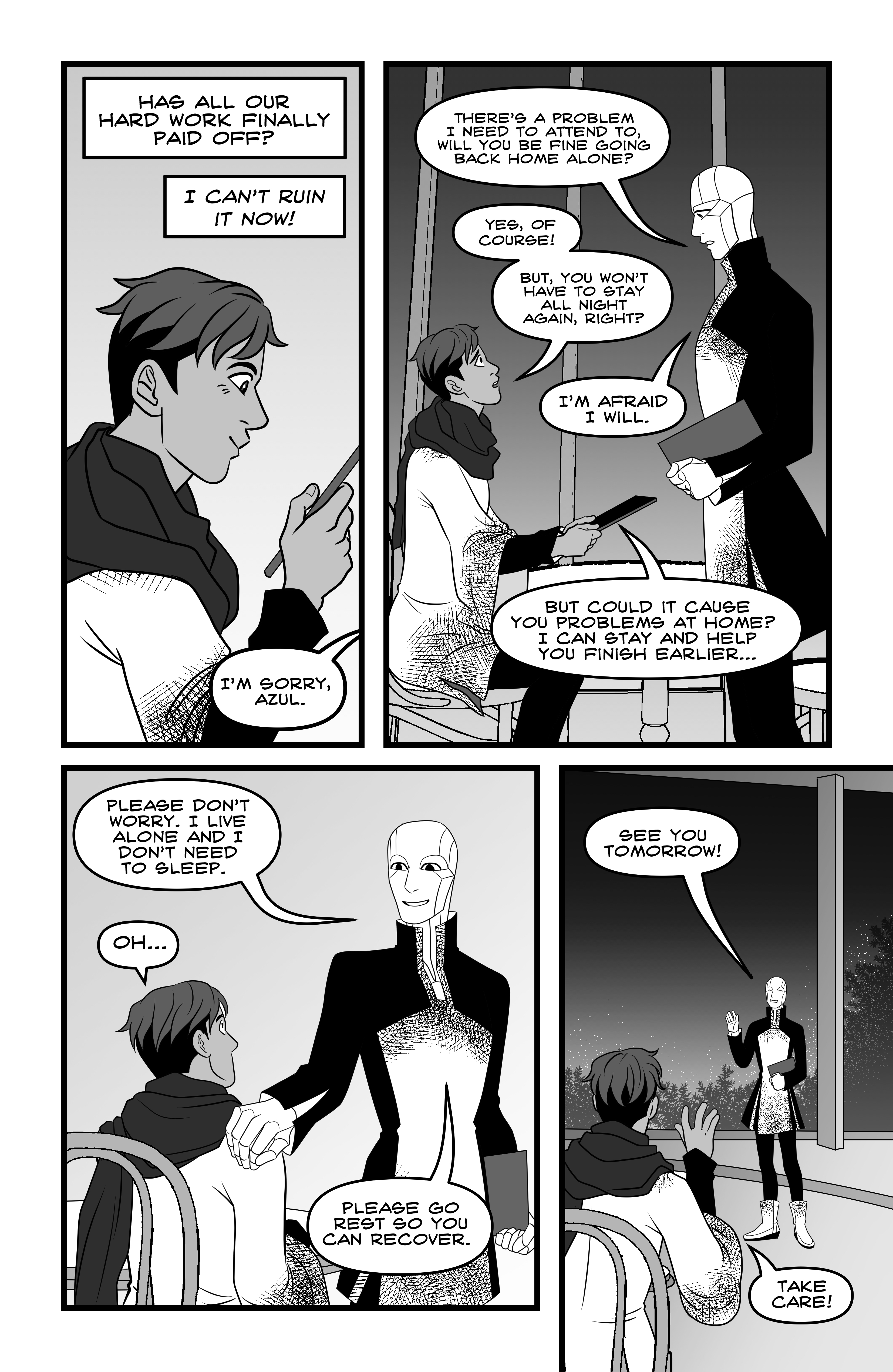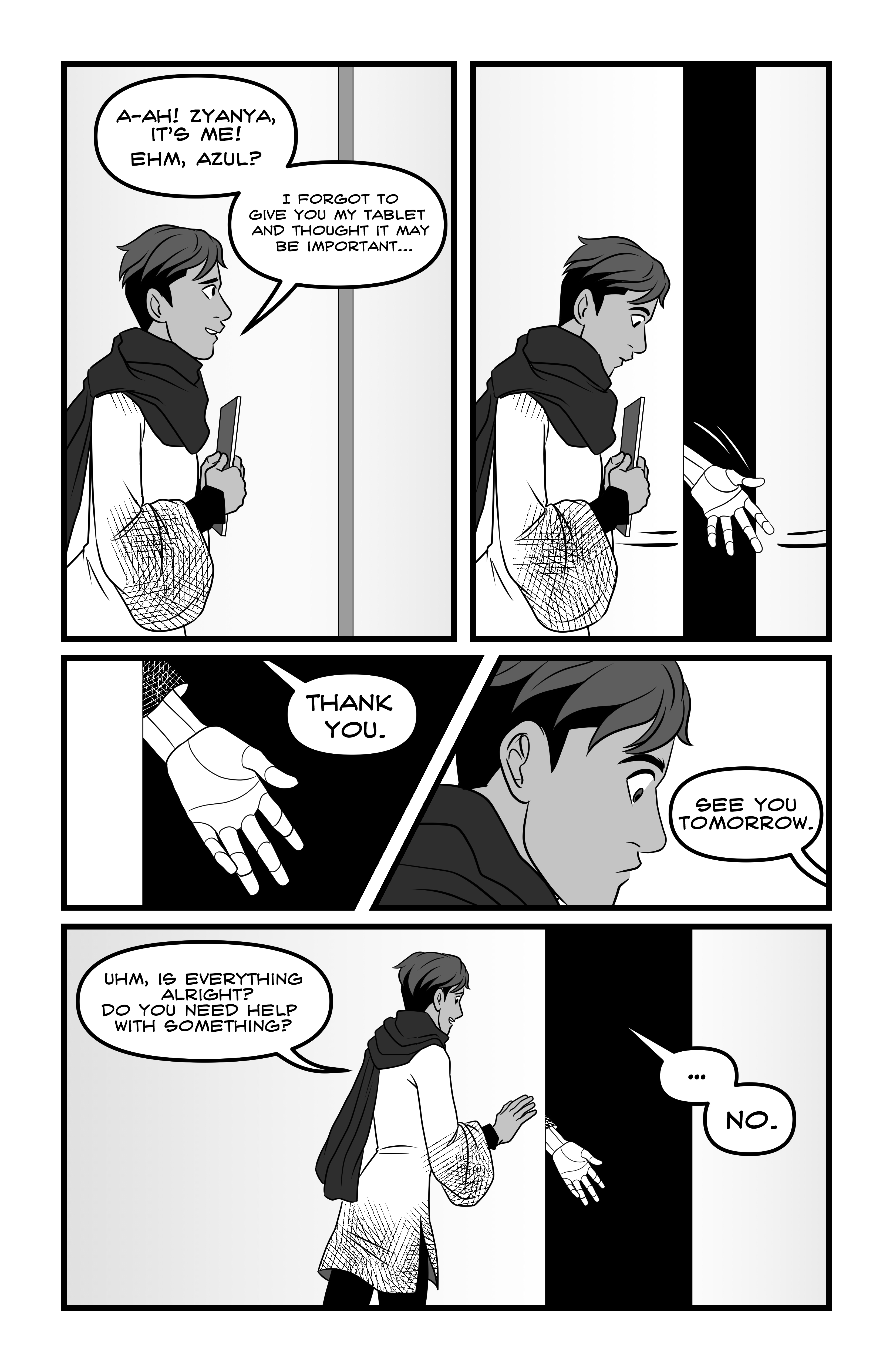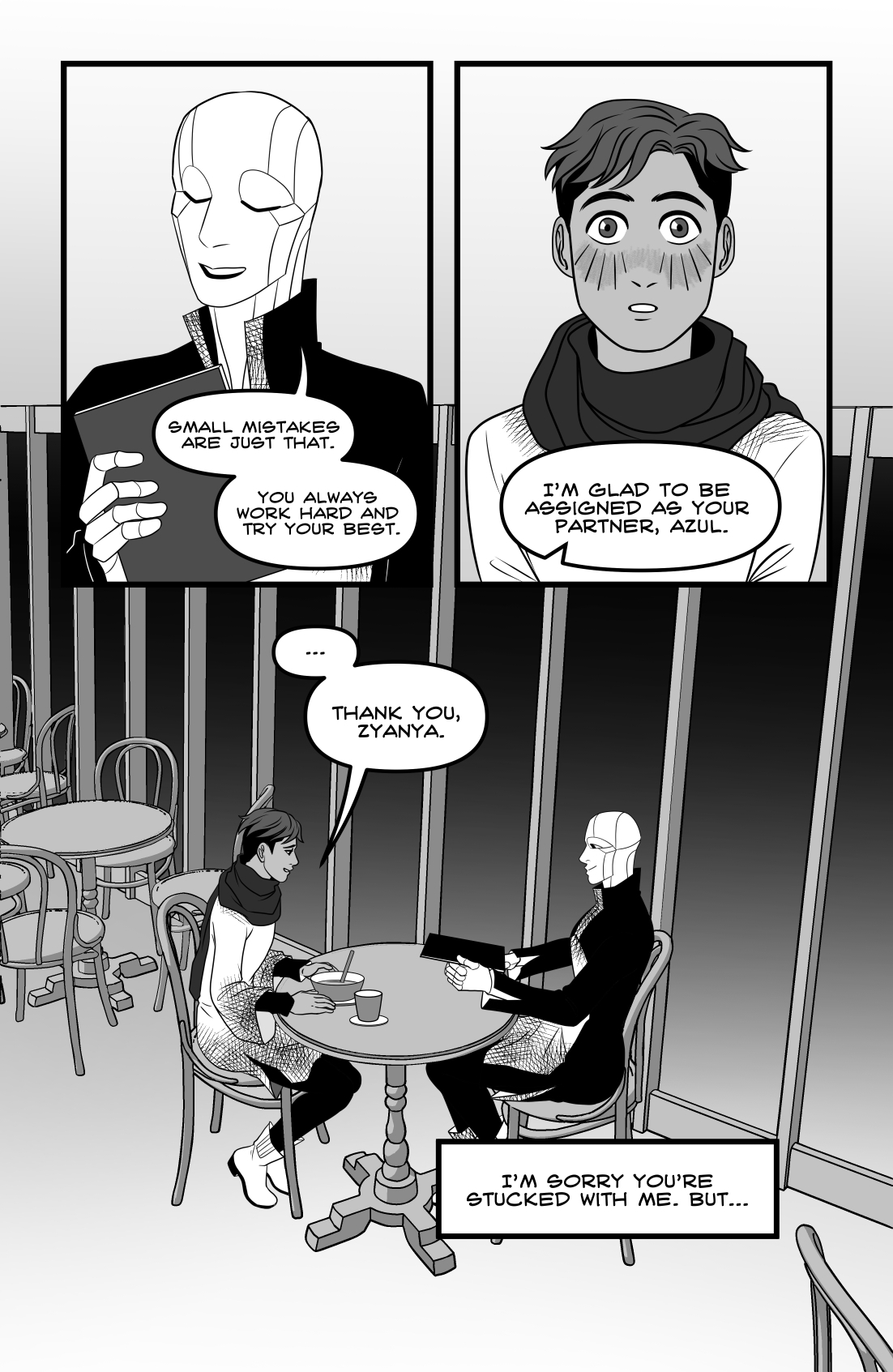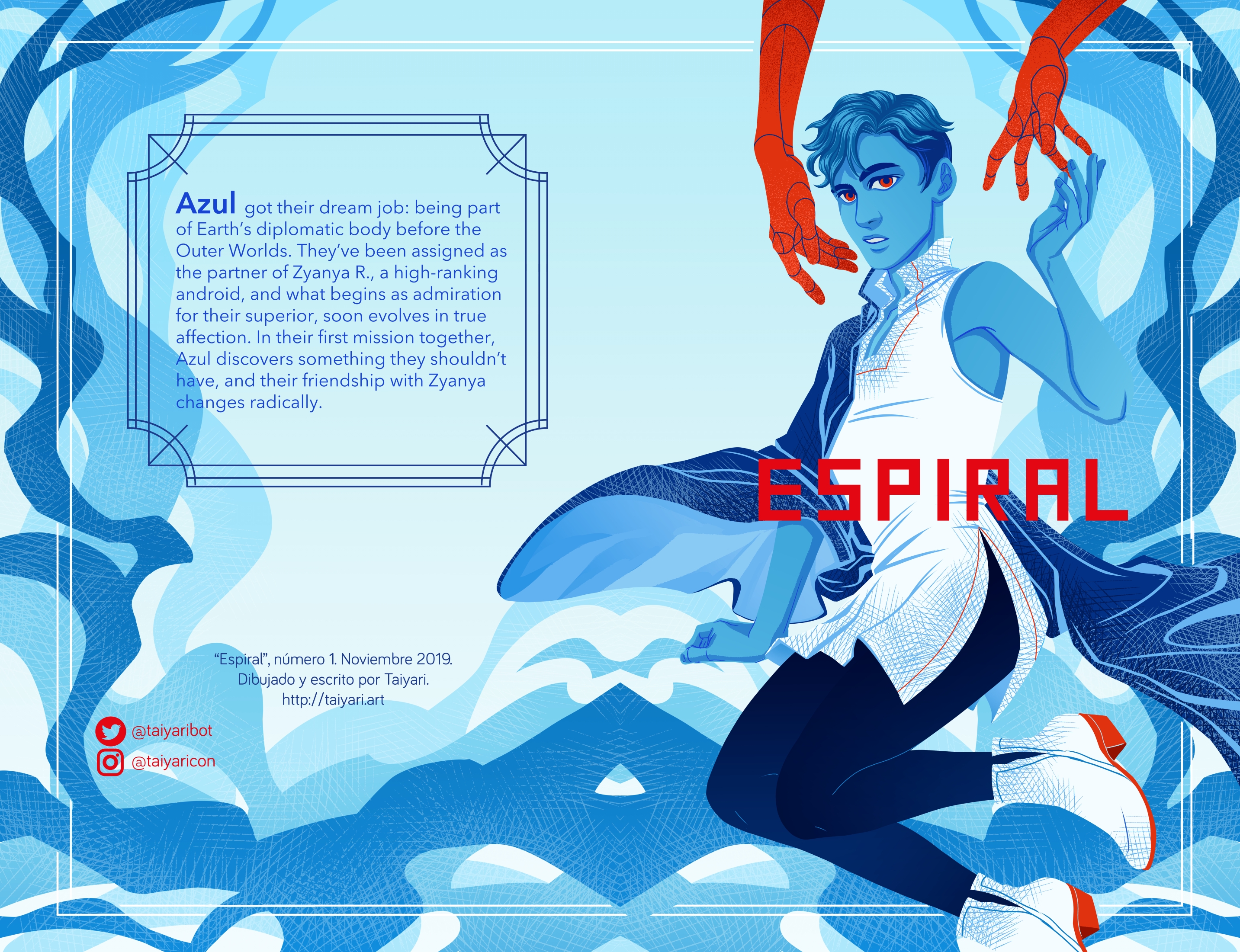 Azul got the job of their life: being part of the diplomatic corps of the Earth before the Outer Worlds. They've been assigned to be a team with Zyanya R., a high ranking android, and what begins as admiration for their superior officer's work, soon develops in honest care. In their first important mission, Azul discovers something they shouldn't have, and their friendship with Zyanya will change radically. 24 pages. Self published in 2019.