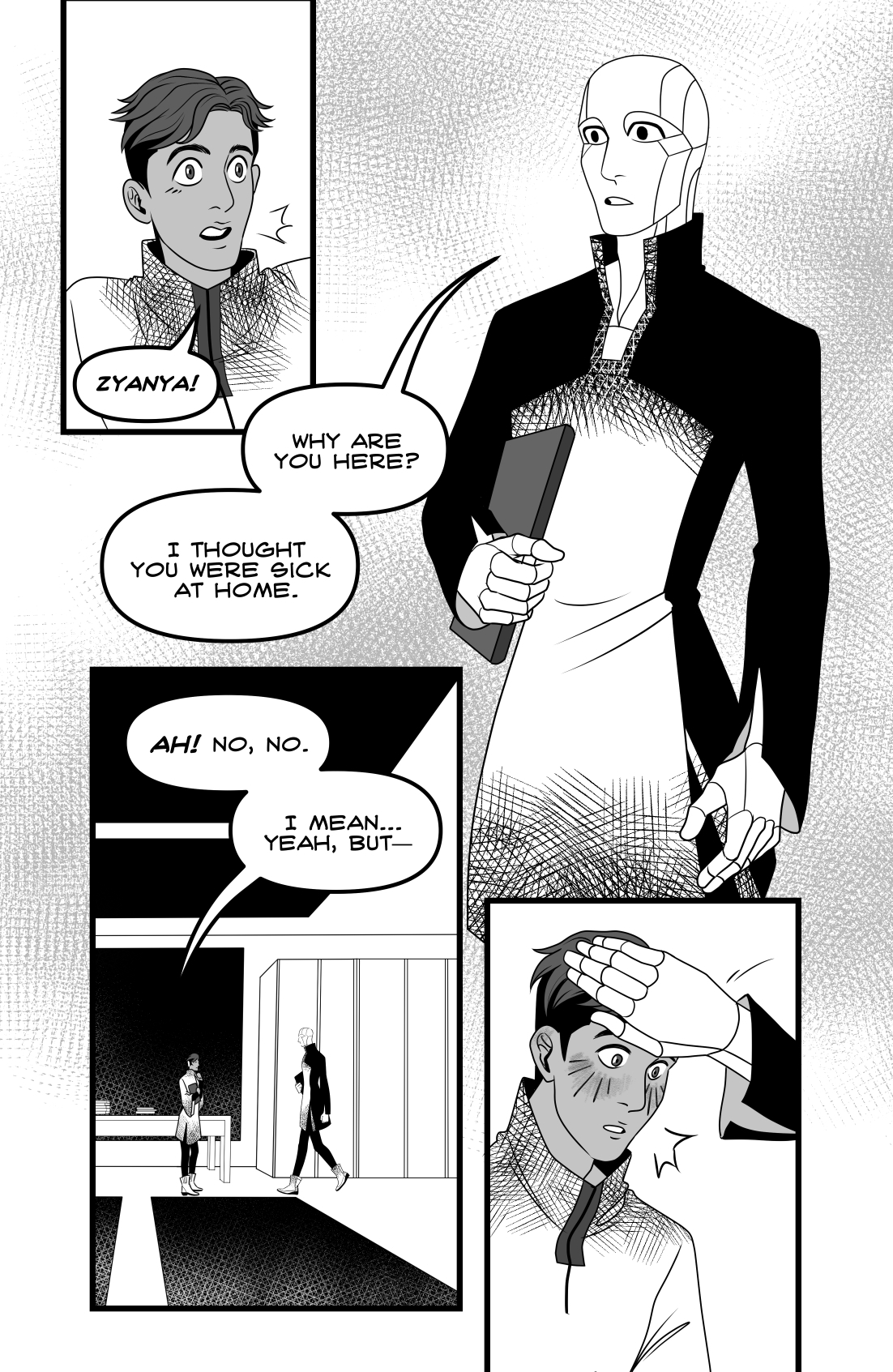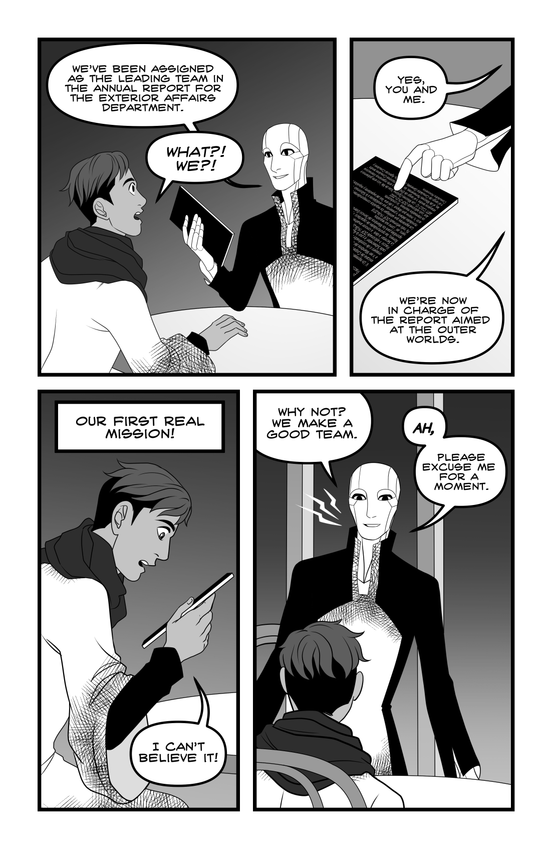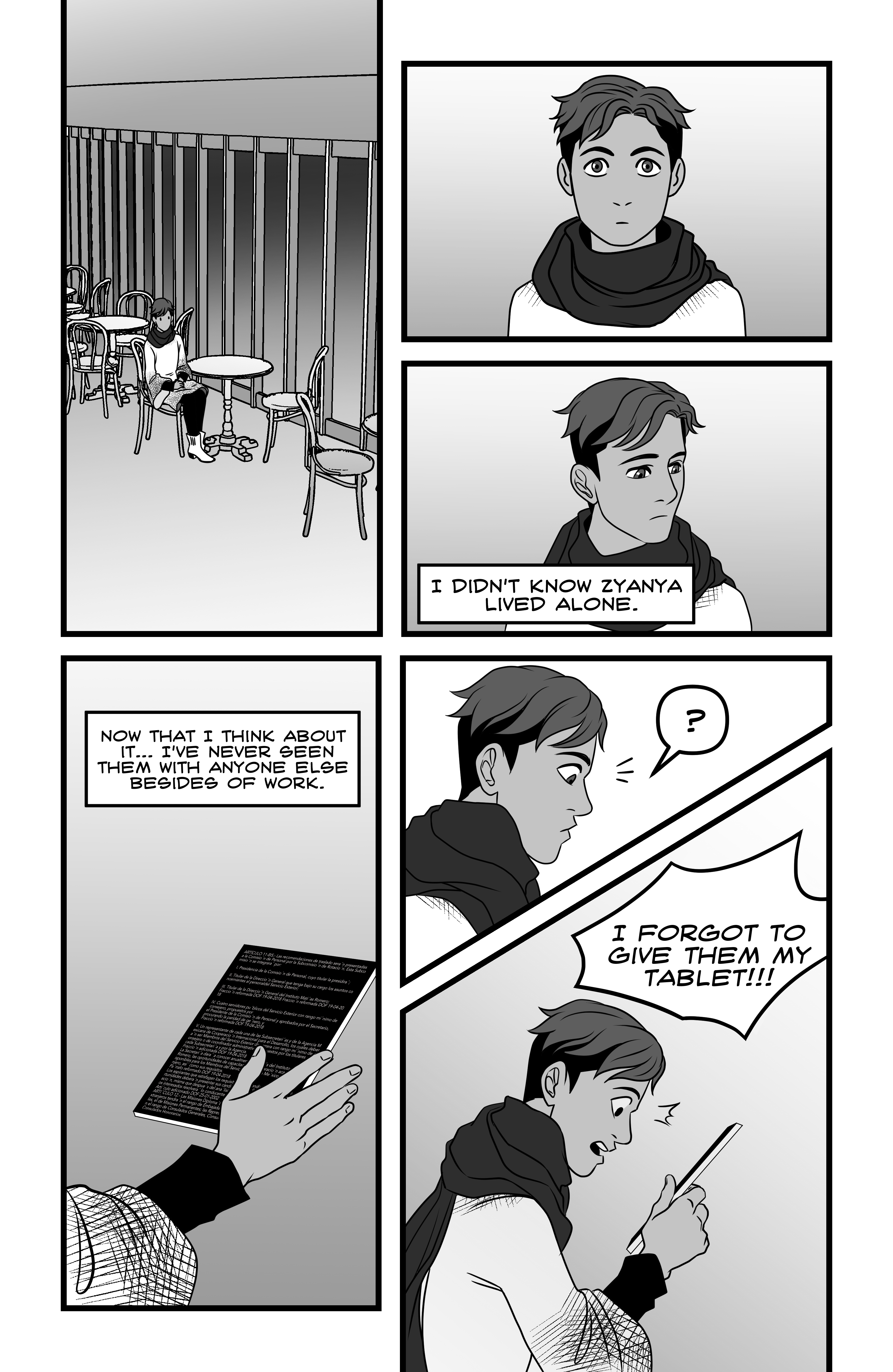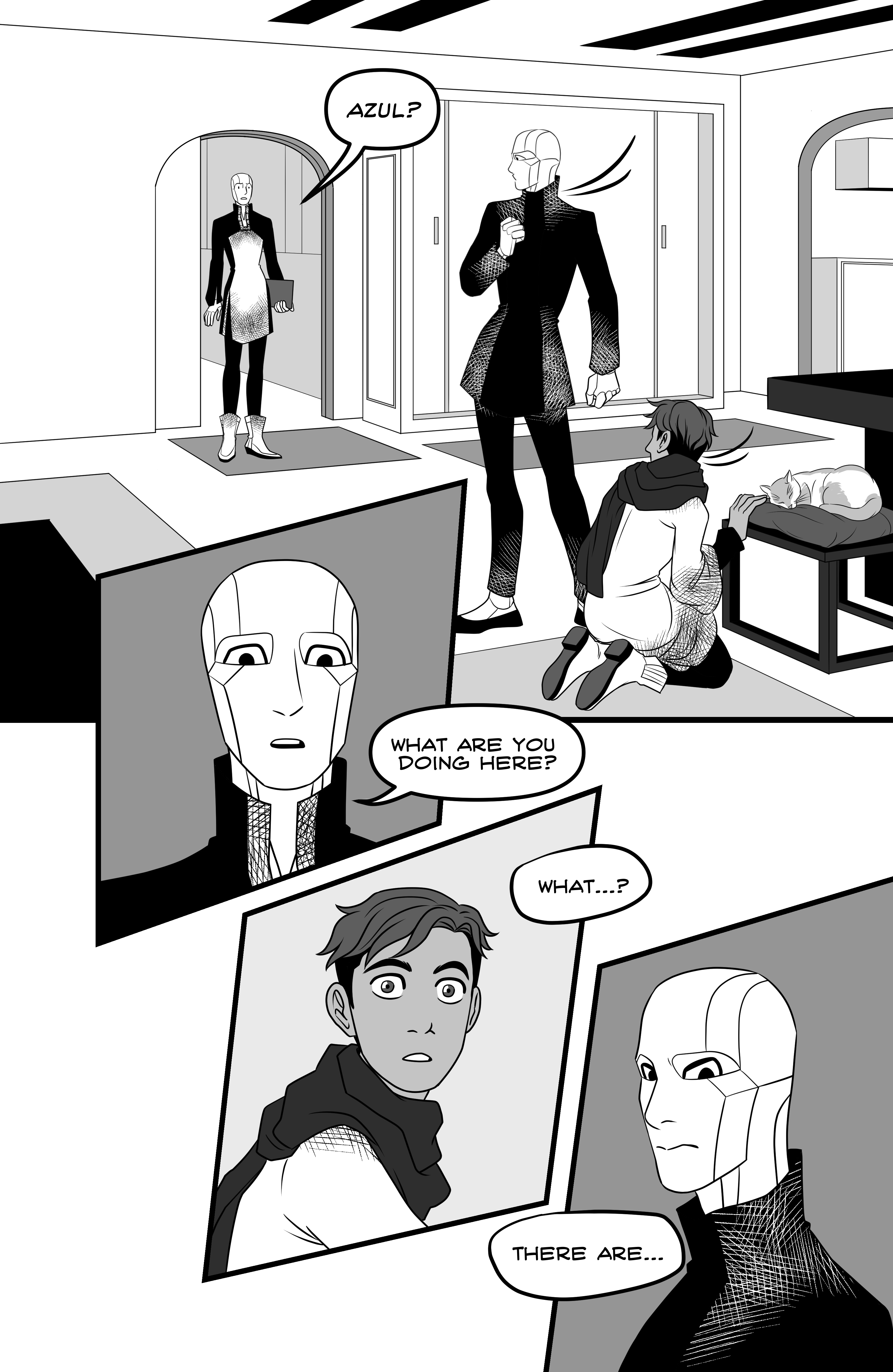 Azul got the job of their life: being part of the diplomatic corps of the Earth before the Outer Worlds. They've been assigned to be a team with Zyanya R., a high ranking android, and what begins as admiration for their superior officer's work, soon develops in honest care. In their first important mission, Azul discovers something they shouldn't have, and their friendship with Zyanya will change radically. 24 pages. Self published in 2019.